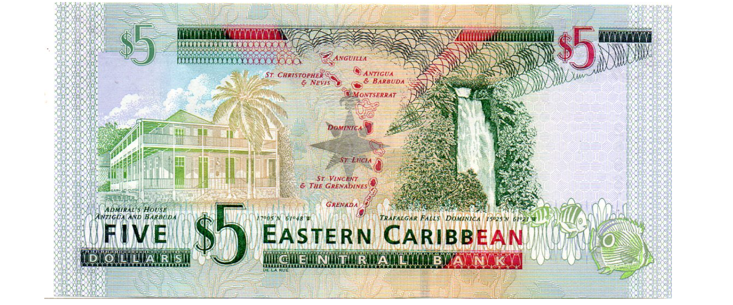 5 Dólares, ND (2008), P-47a, SIN CIRCULAR (UNC), número serial sistema sufijo letra para el miembro individual, Elizabeth II, Casa del almirante (Antigua), Cataratas de trafalgar (Dominica).