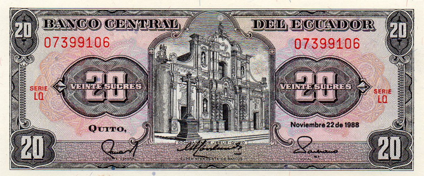 20 Sucres, 22.11.1988 series LQ, P-121Aa, SIN CIRCULAR (UNC), Iglesia de la Compañía de Jesús en Quito, escudo de armas.005