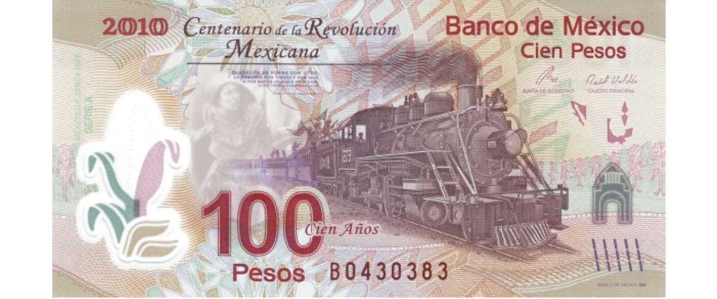 100 Pesos, 2017, SIN CIRCULAR (UNC). SERIE C, error de Impresión: El texto en el frente debajo de la locomotora dice "SUFRAGIO EFECTIVO" - El texto en el reverso en microimpresión dice: "SUFRAGIO ELECTIVO". Anverso: Locomotora de vapor Nr. 279 (vía estrecha 3 pies; disposición de ruedas 1'D; Baldwin 55110) tirando de un tren con revolucionarios. Reverso: Revolucionarios (del cuadro "Del Porfirismo a la Revolución" de David Alfaro Siqueiros).