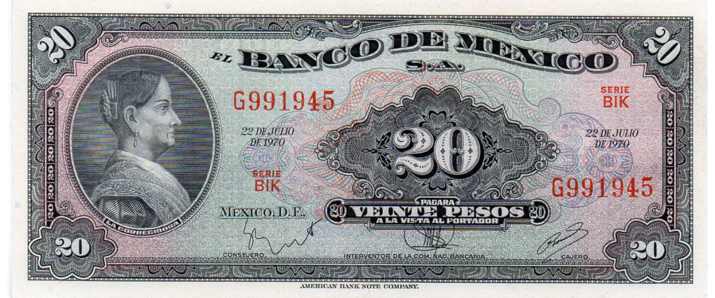 20 Pesos, 22.07.1970, P-54p, SIN CIRCULAR (UNC), series BIG-BIK, Doña Josefa Ortiz ("La Corregidora"), Palacio del Gobierno Federal en Querétaro.