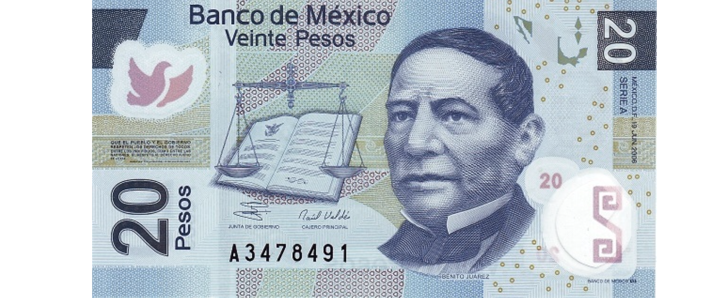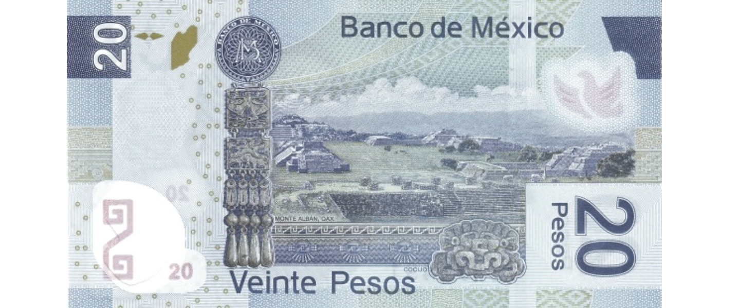 20 Pesos, 2006, SIN CIRCULAR (UNC), material: polímero, anverso: Benito Juárez, reverso: Ruinas de la antigua capital de los Zapotecas en Monte Albán (Oaxaca).