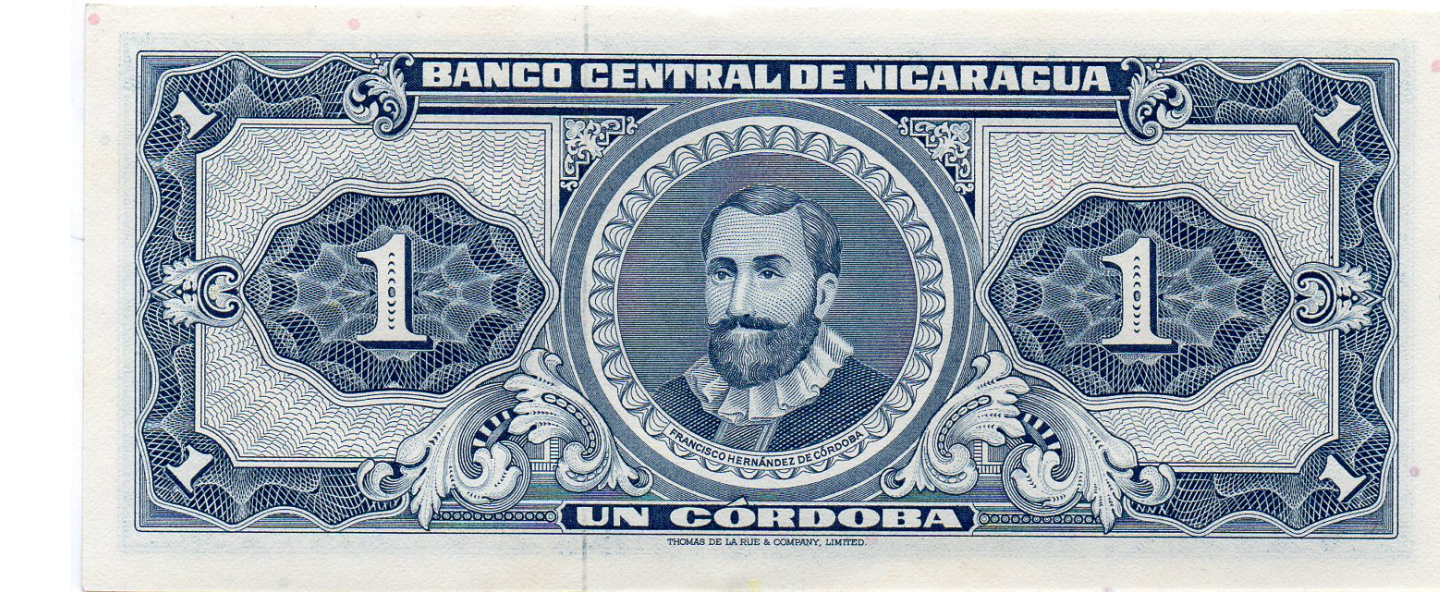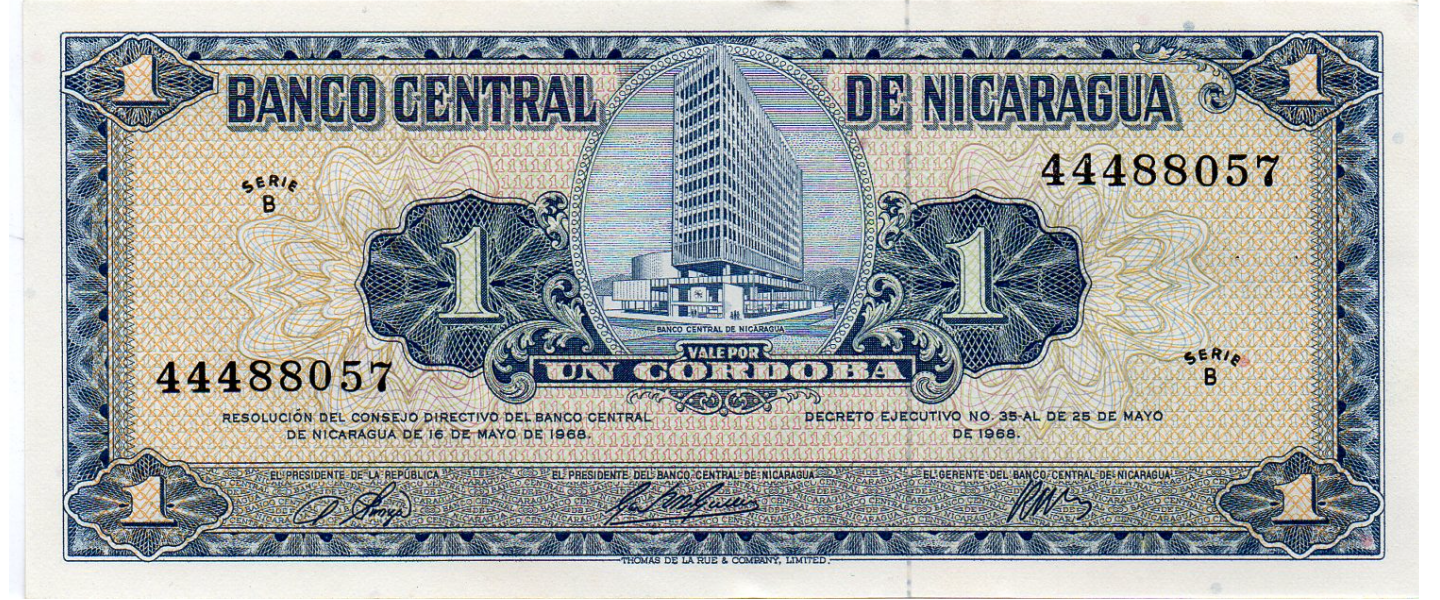 1 Córdoba, D. 25.05.1968, SIN CIRCULAR (UNC), Thomas de la Rue, Londres, anverso: Edificio del Banco Central, Managua; reverso: Francisco Hernández de Córdoba.