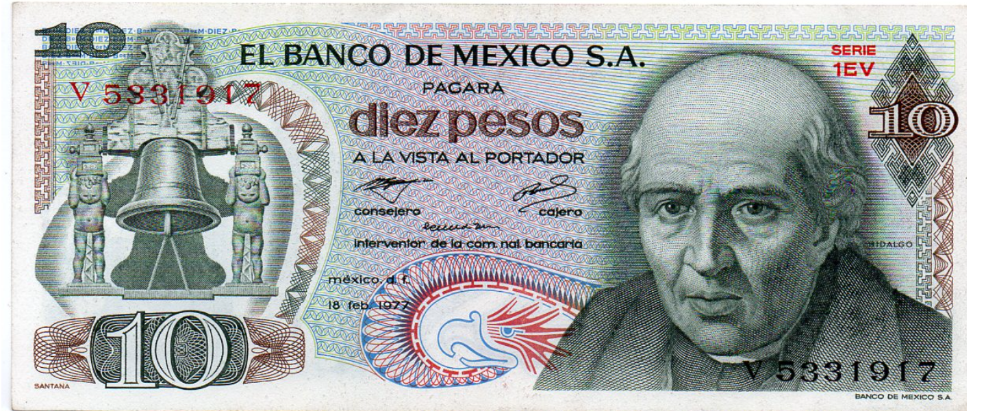 10 Pesos,18.02.1977, P-63i(2), EXTRA FINO (XF), series 1ER-1EV, sello verde en la parte superior derecha del reverso, Miguel Hidalgo y Costilla, Dolores Hidalgo catedral, Guanajuato.