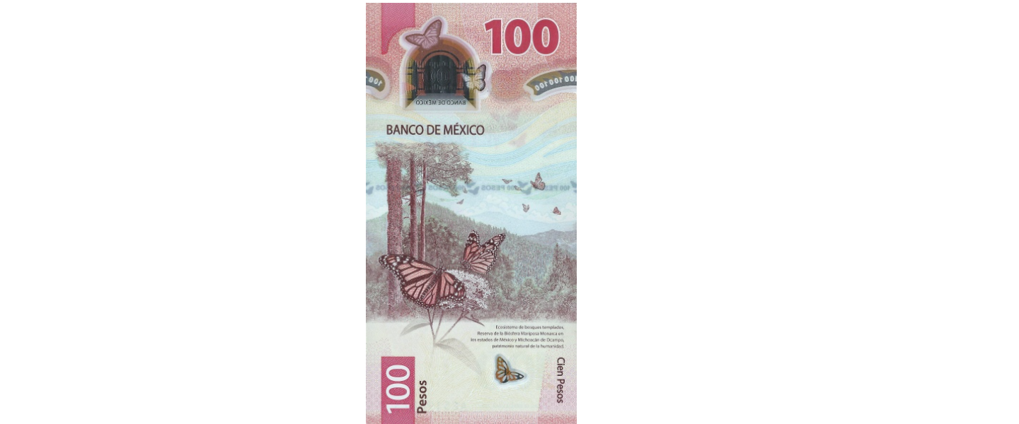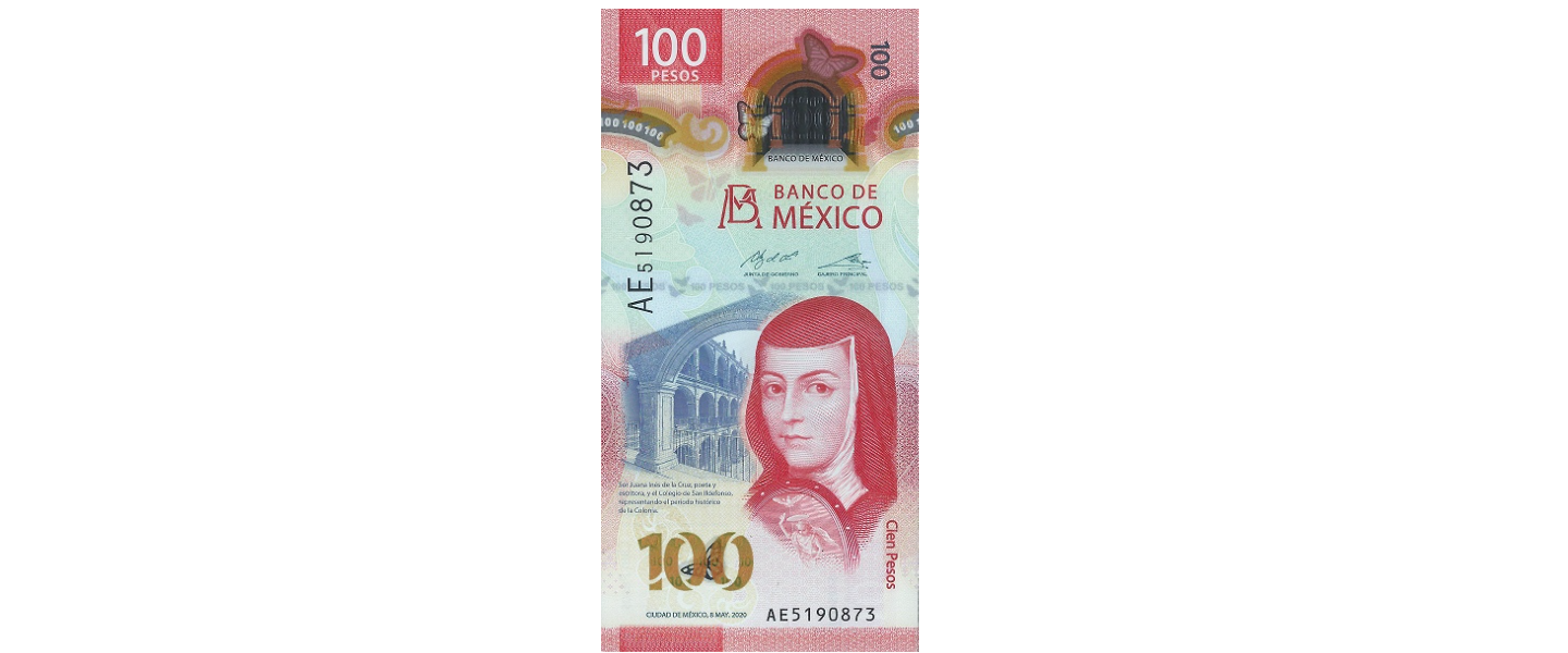 100 Pesos, 08.05.2020, SIN CIRCULAR (UNC), material: polímero, anverso: Juana Inés de la Cruz (Juana de Asbaje y Ramírez) Patio del "Antiguo Colegio" San Ildefonso. Reverso: Bosque templado lluvioso (estados de Michoacán y Ocampo), mariposa monarca. Firmas: Gerardo Esquivel Hernández & Alejandro Alegre Rabiela.