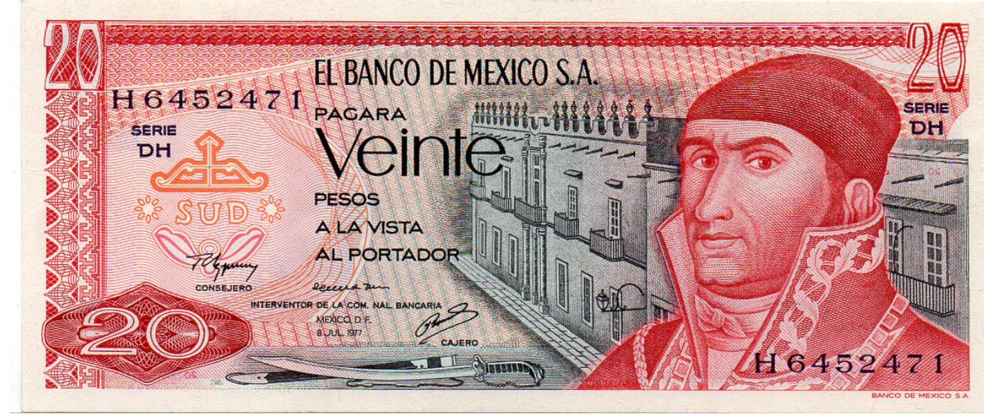 20 Pesos, 08.07.1977, P-64d(3), SIN CIRCULAR (UNC), series DE-DJ, guilloche rojo en la parte superior izq. al reverso, José María Morelos y Pavón, pirámide de Quetzalcóatl.