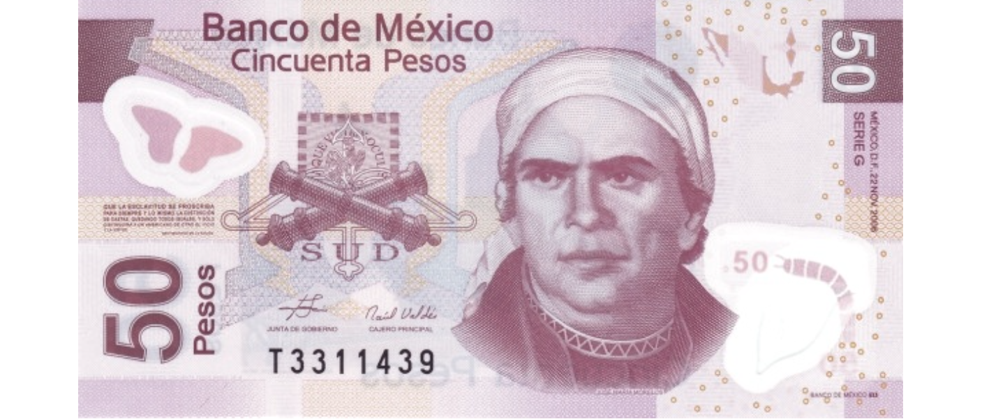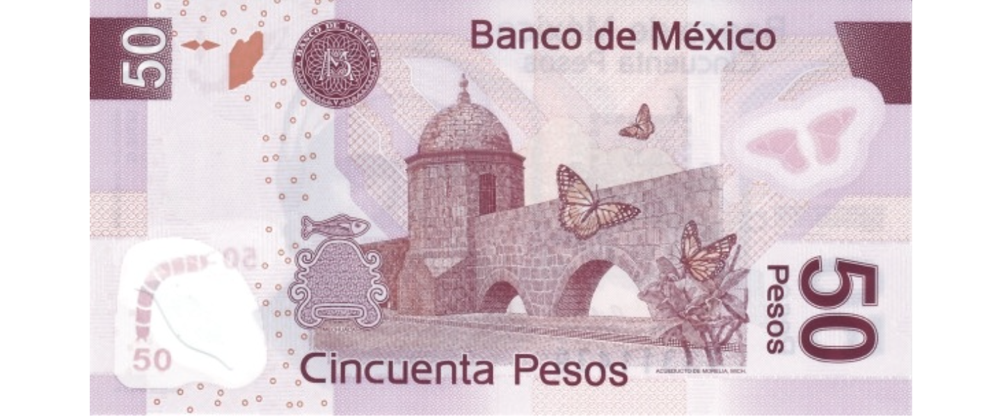 50 Pesos, 2006, SIN CIRCULAR (UNC), material: polímero, anverso: José María Morelos y Pavón; reverso: Acueducto en Morelia (Michoacán), mariposa virrey (Limenitis archippus).