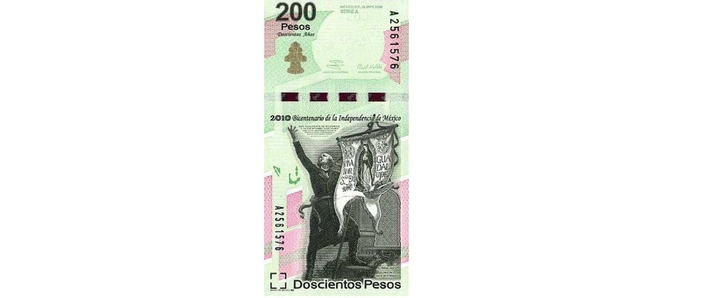 200 Pesos, 15.09.2008, SIN CIRCULAR (UNC), Conmemorativo Bicentenario de la Independencia 1810-2010, anverso: Miguel Hidalgo y Costilla con bandera de Virgen de Guadalupe (del cuadro "Don Miguel Hidalgo" de Jesús Enrique Emilio de la Helguera Espinoza), prefijo E. Reverso: Ángel de la Independencia.