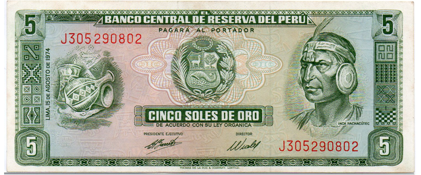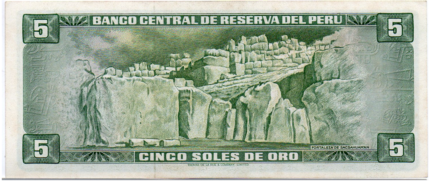 5 Soles de Oro, 15 agosto 1974, CASI SIN CIRCULAR (AUNC), Inca Pachacútec, reverso: Fortaleza de Sacsayhuamán.