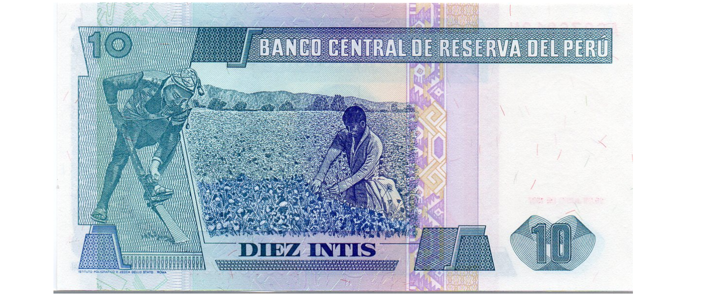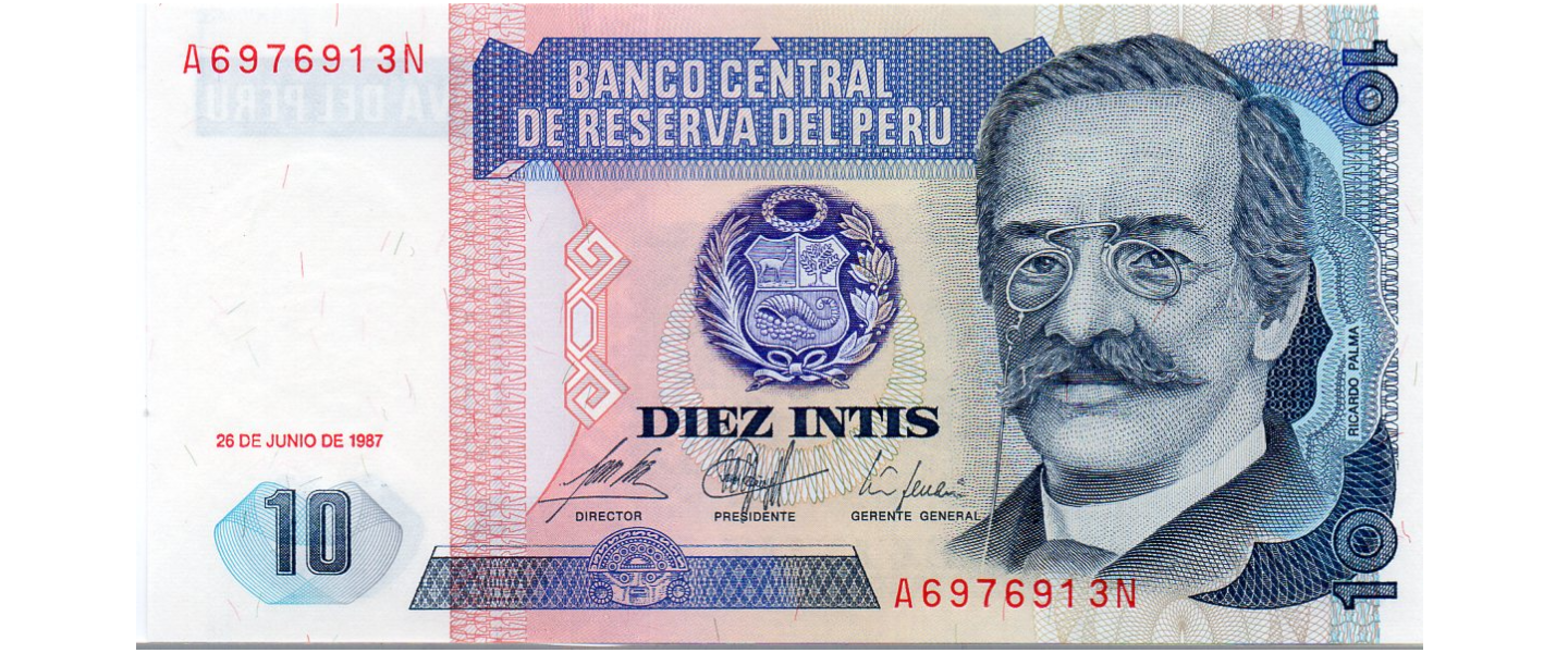 10 Intis, 26.06.1987, P-129, SIN CIRCULAR (UNC), Impresor: Istituto Poligrafico e Zecca dello Stato, Rome, Ricardo Palma, trabajador, mujer.