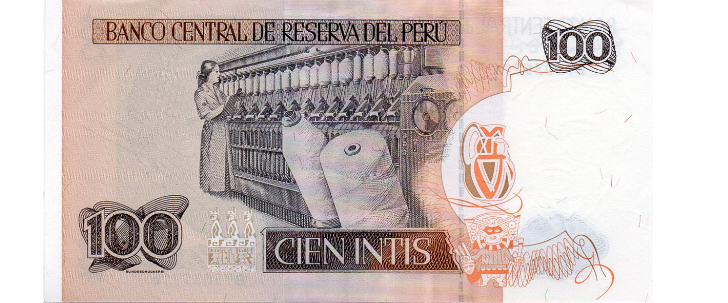 100 Intis, 26.06.1987, P-133, SIN CIRCULAR (UNC), Ramón Castilla, Bastidor de hilado de algodón.
