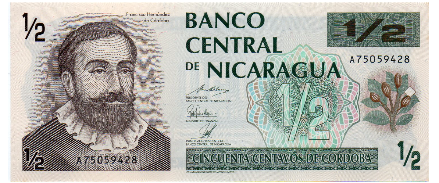 50 centavos de Córdoba, ND (1992), SIN CIRCULAR (UNC), Canadian Bank Note Company, anverso: Francisco Hernández de Córdoba; reverso: Armas, Sacuanjoche (Flor Nacional).