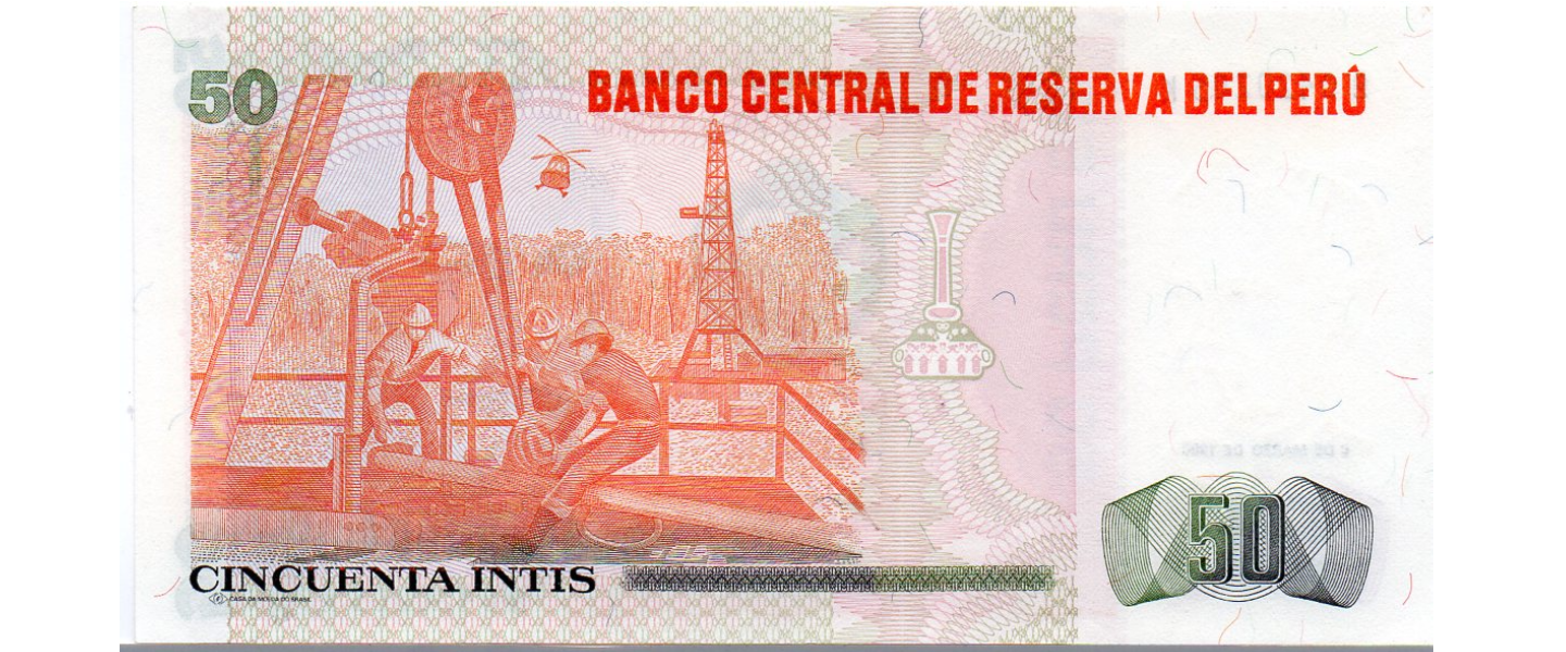 50 Intis, 06.03.1986, P-131a, SIN CIRCULAR (UNC), Nicolas de Piérola, plataforma de perforación.