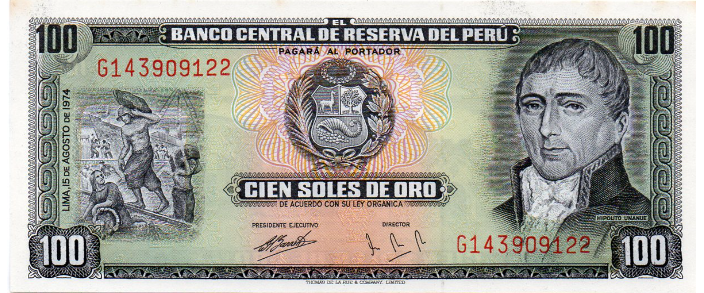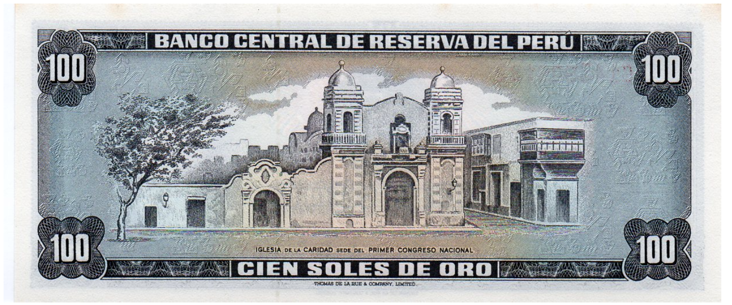 100 Soles de Oro, 15.08.1974, P-102c, SIN CIRCULAR (UNC), Impresor: Thomas de la Rue, Londres, Hipólito Unanue, Iglesia de la Caridad (lugar del primer congreso nacional).