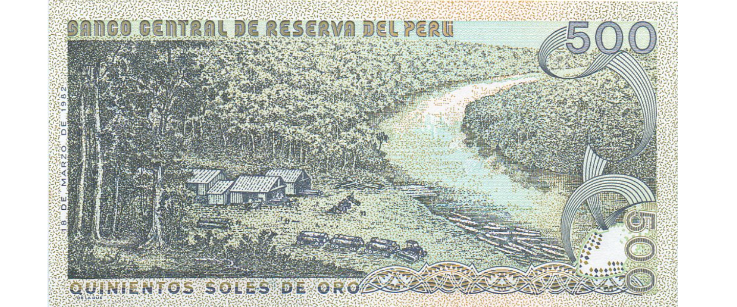 500 Soles de Oro, 18.03.1982, P-125A, SIN CIRCULAR (UNC), Impresor: De la Rue, Londres, José Abelardo Quiñones González, paisaje selvático.
