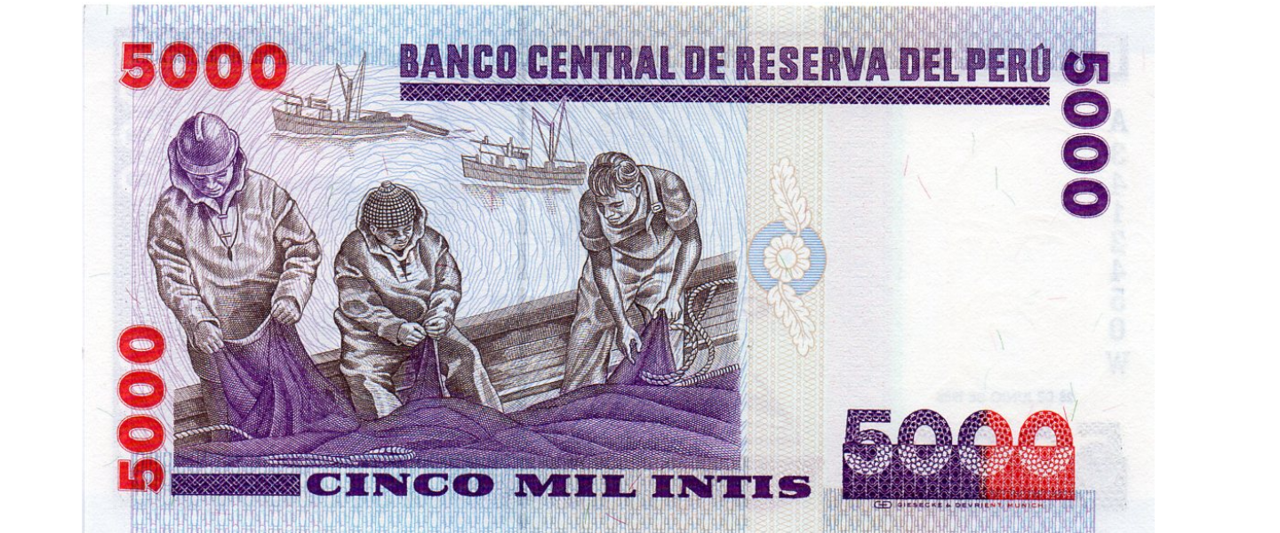 5.000 Intis, 28.06.1988, P-137, SIN CIRCULAR (UNC), Impresor: Giesecke & Devrient, Munich, Miguel Grau, pescadores.