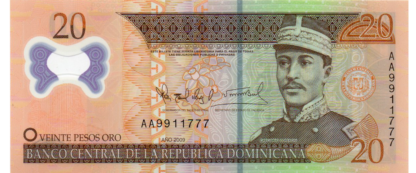 20 Pesos Oro, 2009, P-182a, Impresor: Oberthur, Francose, material en polímero, Gregorio Lúperon, panteón nacional.