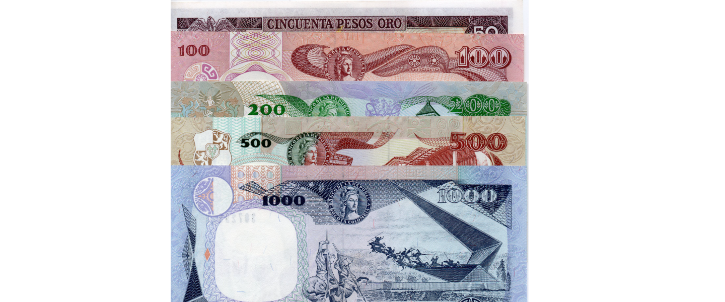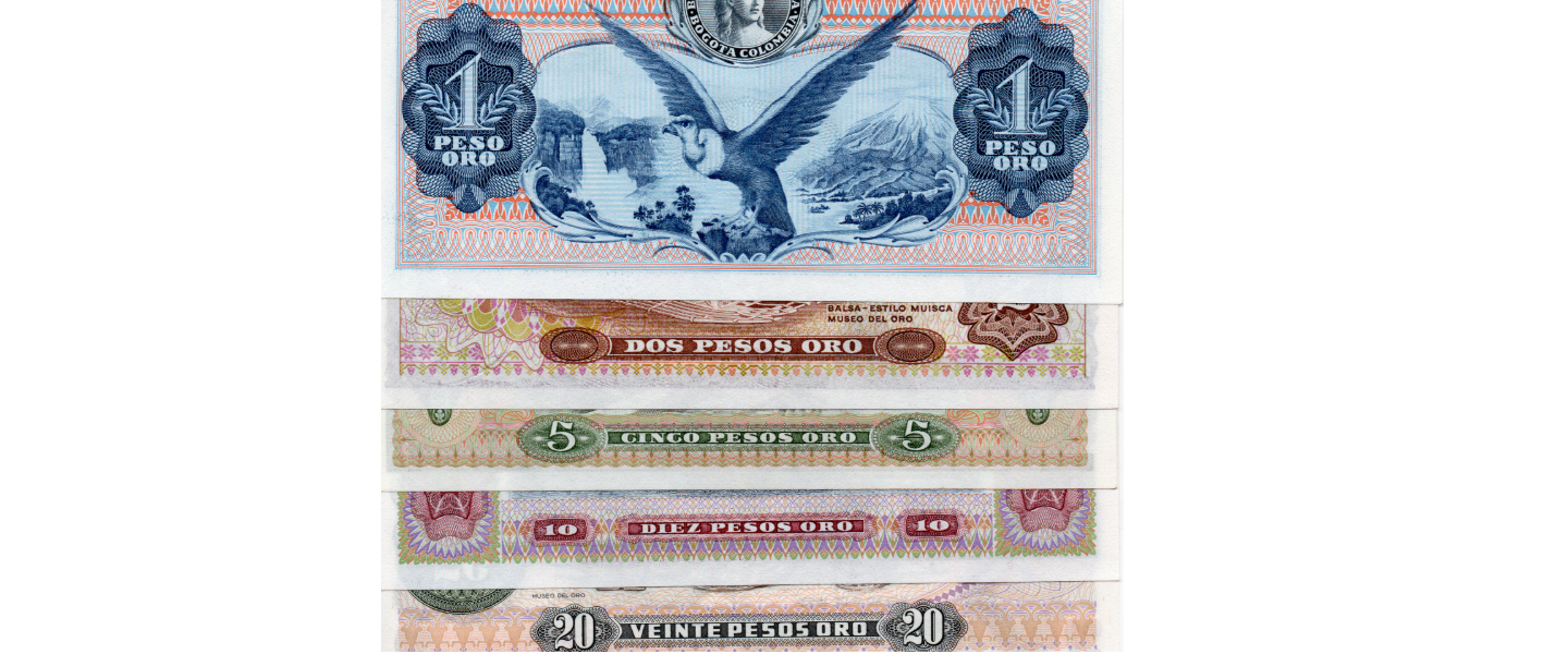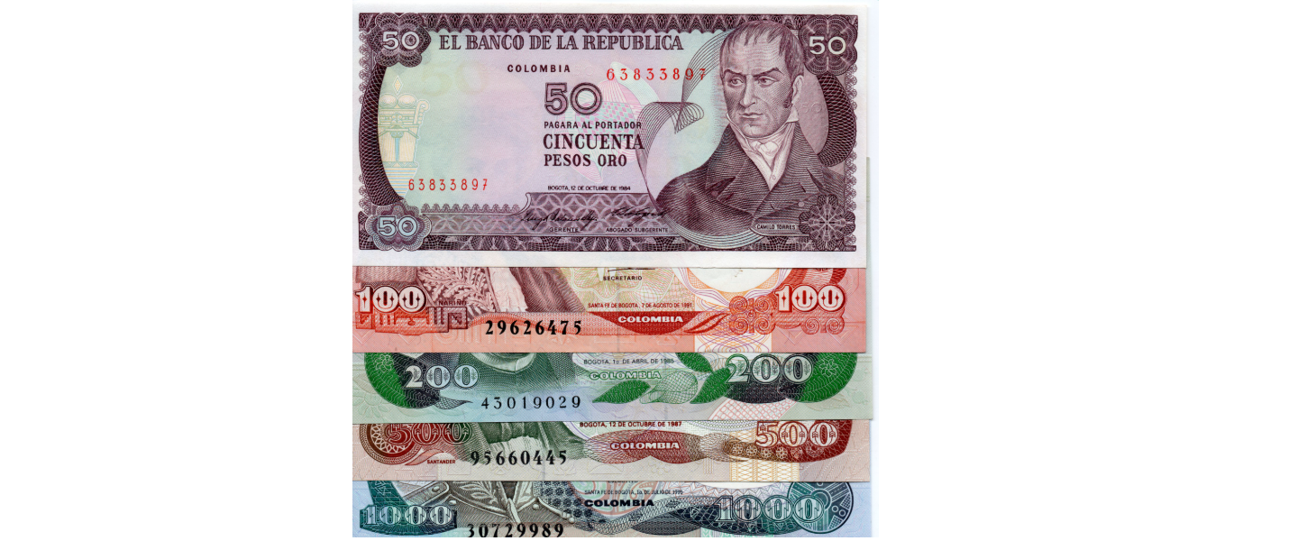 Set conformado por diez (10) billetes de Colombia-BRC, en estado UNC, fechas variadas, denominaciones de 1,2,5,10,20,50,100,200,500 y 1000 pesos.