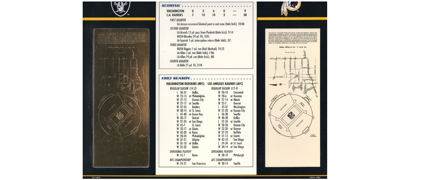 Tarjeta de puntuación conmemorativa del Super Bowl XVIII con reproducción del boleto en laminilla de oro de 22 quilates, enero 22 de 1984, en perfecto estado de conservación.