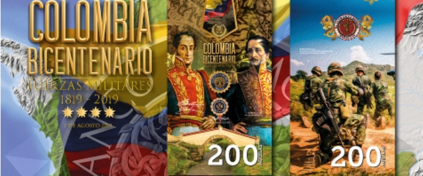 Set de dos (2) billetes BICENTENARIO COLOMBIA, elaborados por Banco de la Moneda, Medellín. Denominaciones de 100 y 200 águilas, poseen realidad aumentada.