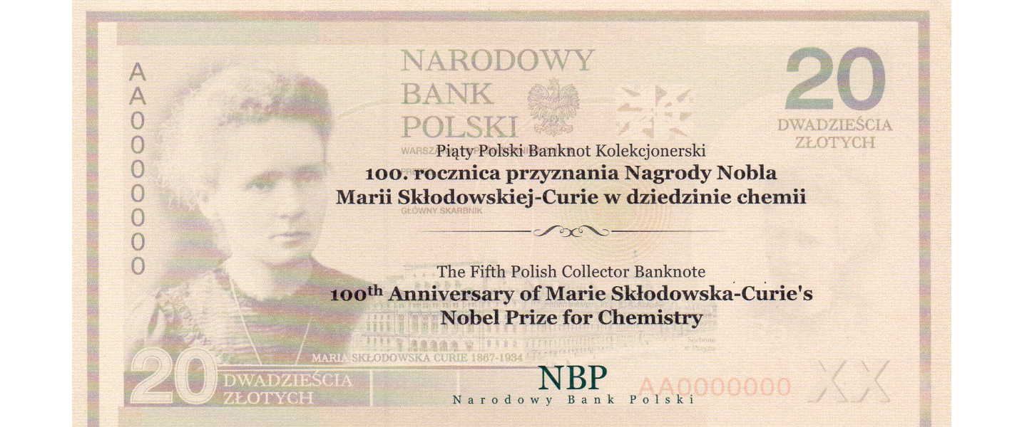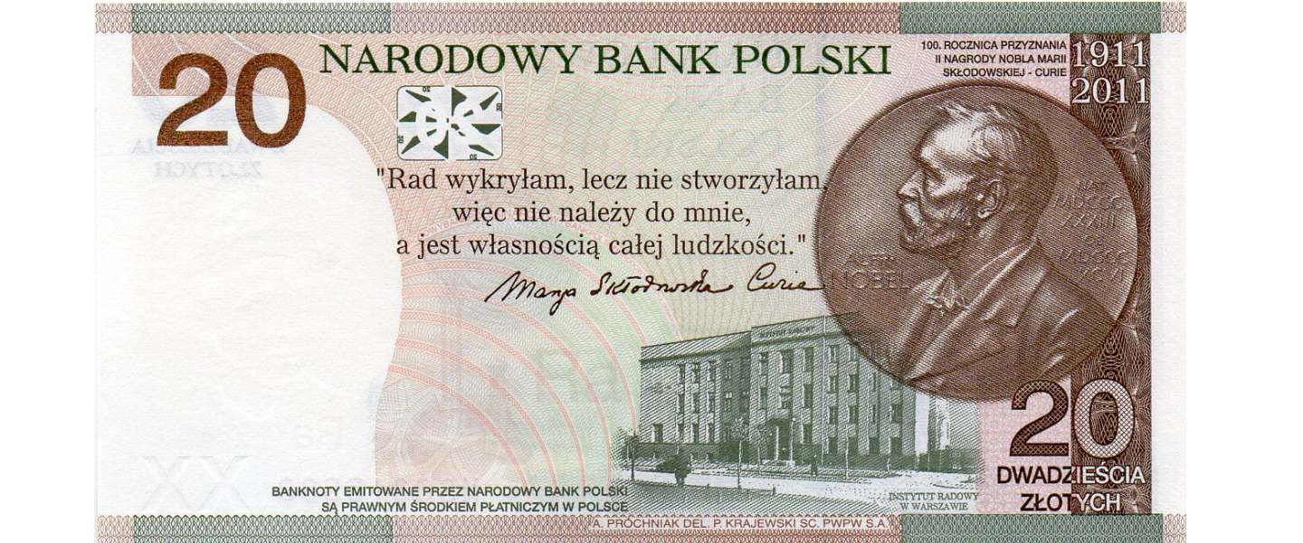 20 Zloty, 20.04.2011, SIN CIRCULAR (UNC), P A184, Maria (Marie) Skłodowska-Curie; Universidad de la Sorbona (París). Reverso: Cita de Marie Curie ("He detectado el radio, pero no lo he creado; la gloria no me pertenece, pero es propiedad de toda la humanidad"); Radium Institut (Varsovia); Medalla del Premio Nobel de Química. Conmemorativo al Centenario del Premio Nobel a Marie Curie (1911), viene en estuche protector de cartón.