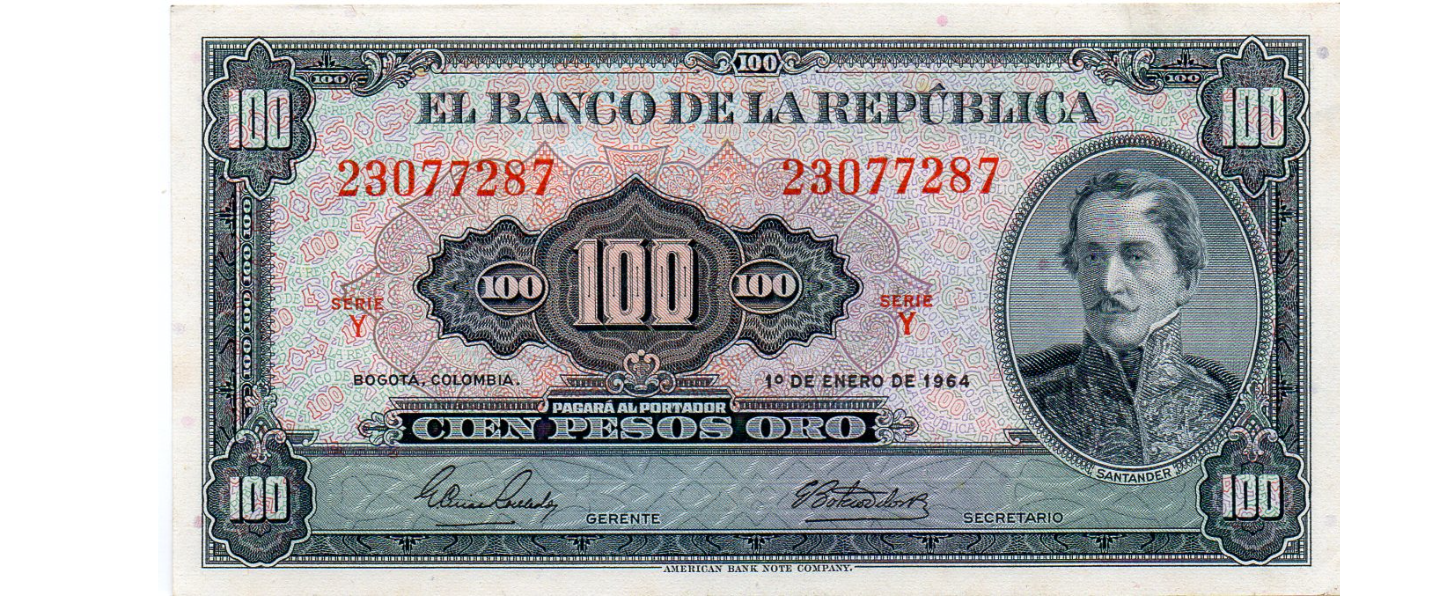 100 Pesos, 01 de enero de 1964, SIN CIRCULAR (UNC) NET: pequeña mancha al reverso parte superior, ABNC, anverso: Francisco de Paula Santander.