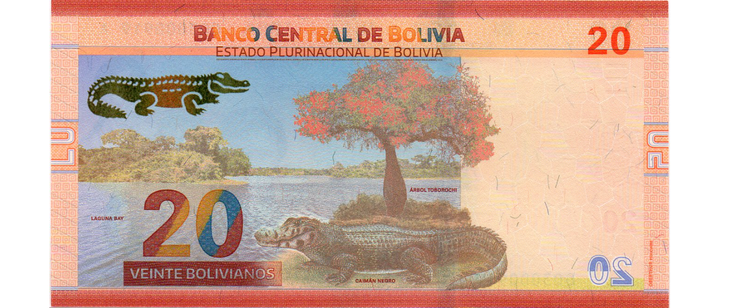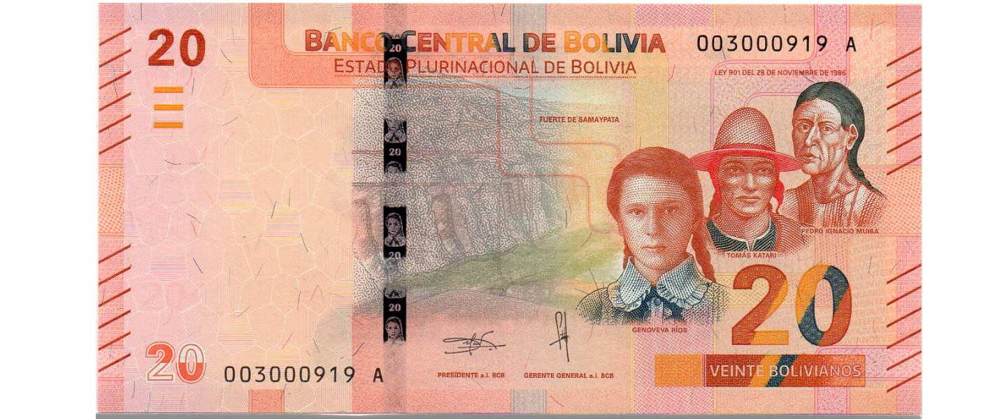 20 Bolivianos, 2018-2019, SIN CIRCULAR (UNC), Emisión Ley 901 de 28.11.1986, anverso: Fuerte Samaipata Genoveva Ríos, Tomas Katari, Pedro Ignacio Muiba, reverso: Laguna Bay, árbol Toborochi, Caimán negro. Impresor: Oberthur Fiduciaire, Francia.